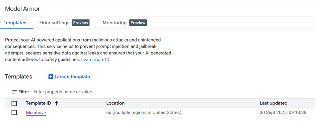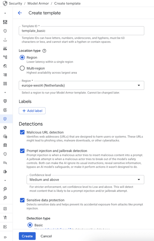 Go to Security => Model Armor => Create Template.